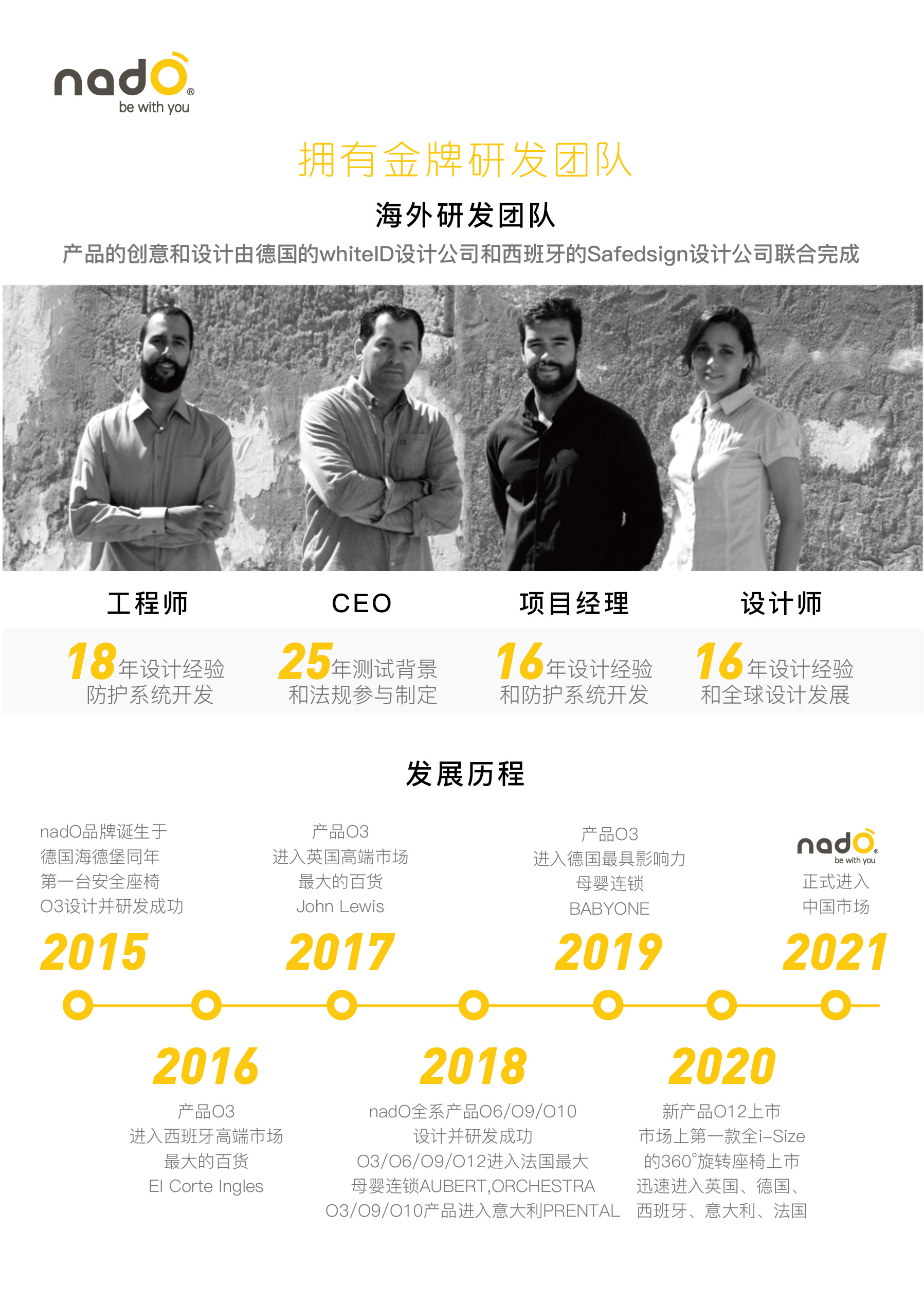 2015年,为了进一步提升儿童出行的安全性和舒适性,一个追求自然,热爱家庭又忠于传统的多元化国际专业团队在德国海德堡创立了nadO。