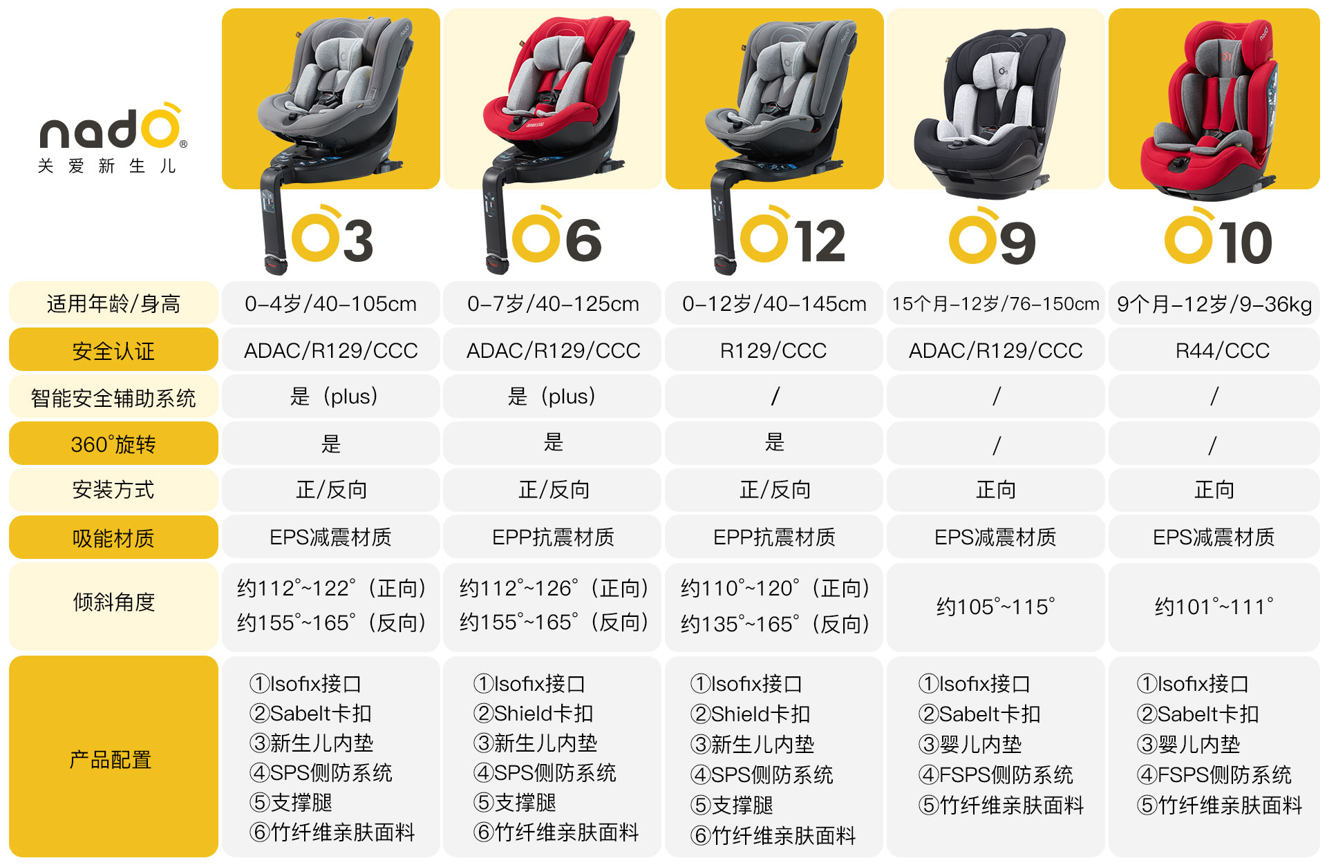 l 安全认证:nadO全系列产品均有中欧双标认证。部分型号座椅,采用真车碰撞测试,测试标准高,测试难度大,座椅安全性更高。设计的